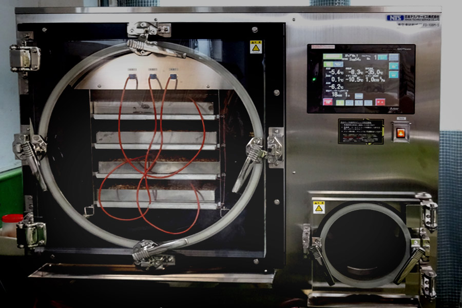 フリーズドライ製法とは、日本では50年以上前から急速に普及した技術で《真空凍結乾燥》ともいいます。マイナス35℃以下に冷凍した納豆を減圧し、真空状態を維持しながら時間をかけて加熱して作ります。 当社が《真空凍結乾燥》のフリーズドライにこだわるのは、加水すると粘りが蘇り納豆そのものを味わえることです。それでいて保存性に優れ、長期間おいしさが持続します。ドライ納豆そのものはサラッとしていてネバリはありませんが、素材の納豆に妥協は許しません。”上質な美味しい納豆をシンプルな製法で乾燥させる”それが当社のdry nattoです。